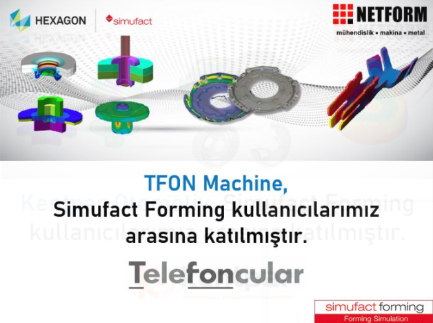 TFON Machine, Simufact Forming'i seçti 14 Eylül 2021 TFON Machine & Crane Co. metal şekillendirme ve Ar-Ge çalışmalarında kullanmak üzere Simufact Forming yazılımını tercih etti.