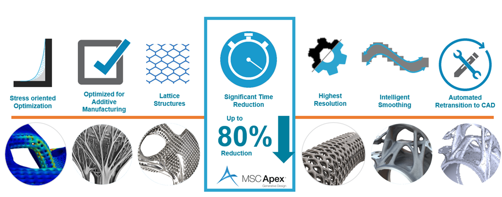 MSC Apex Generative Design ile özellikle eklemeli imalat yöntemi ile üretilecek parçaların, konvansiyonel yöntemler ile çok uzun süren ve birden fazla yazılım kullanılarak yapılan topoloji optimizasyonu, tek bir platformda çok daha kısa sürede yapılabilir.